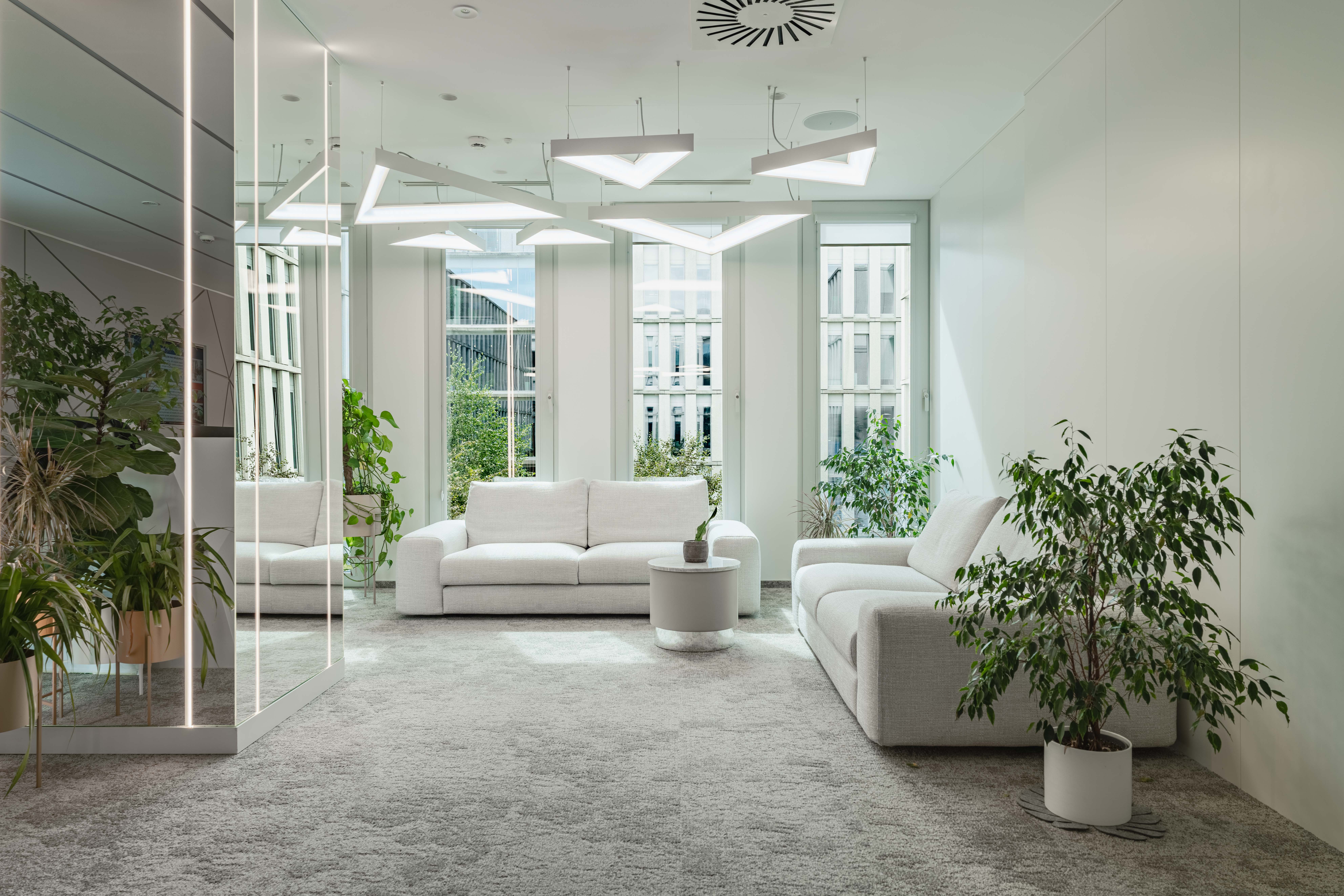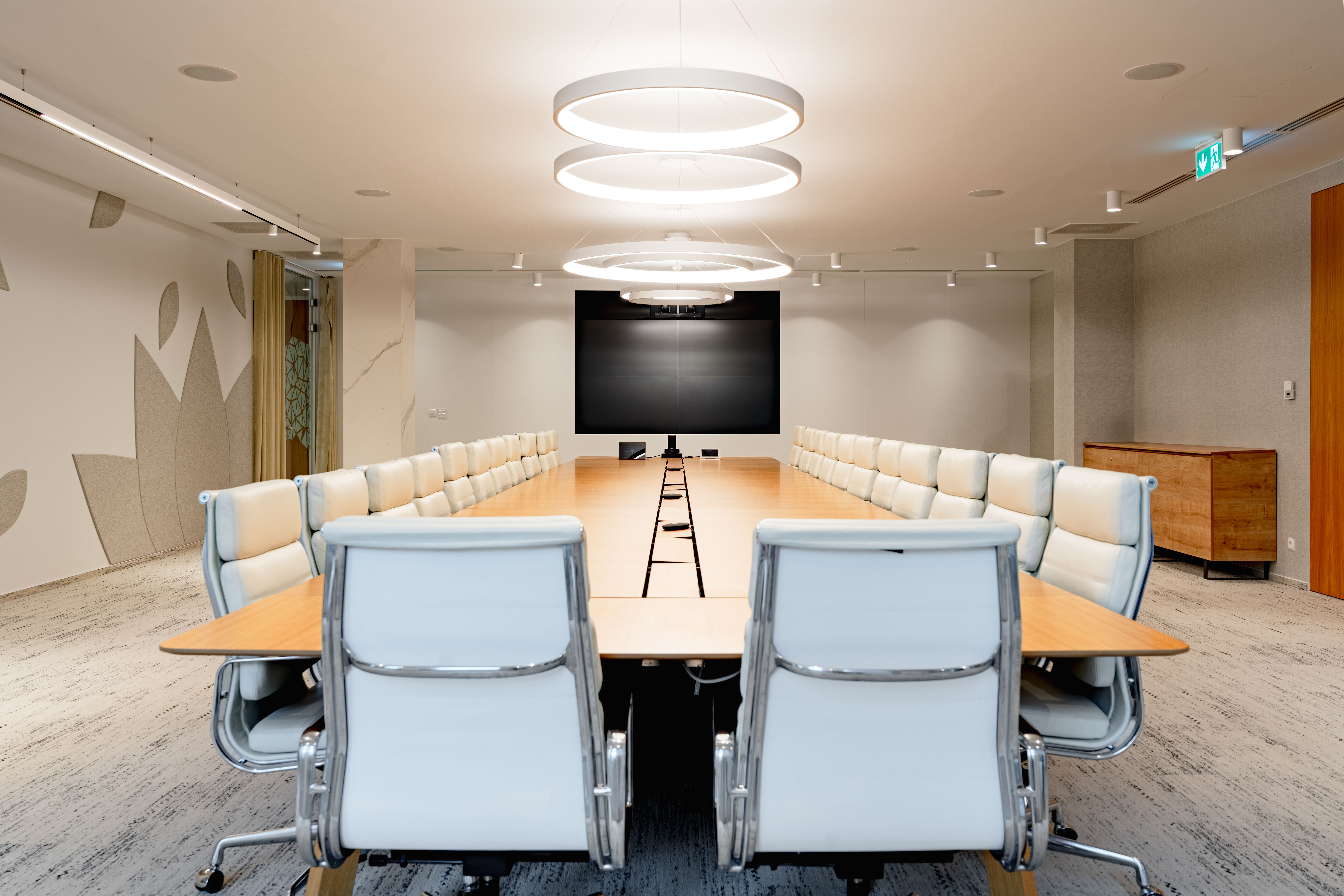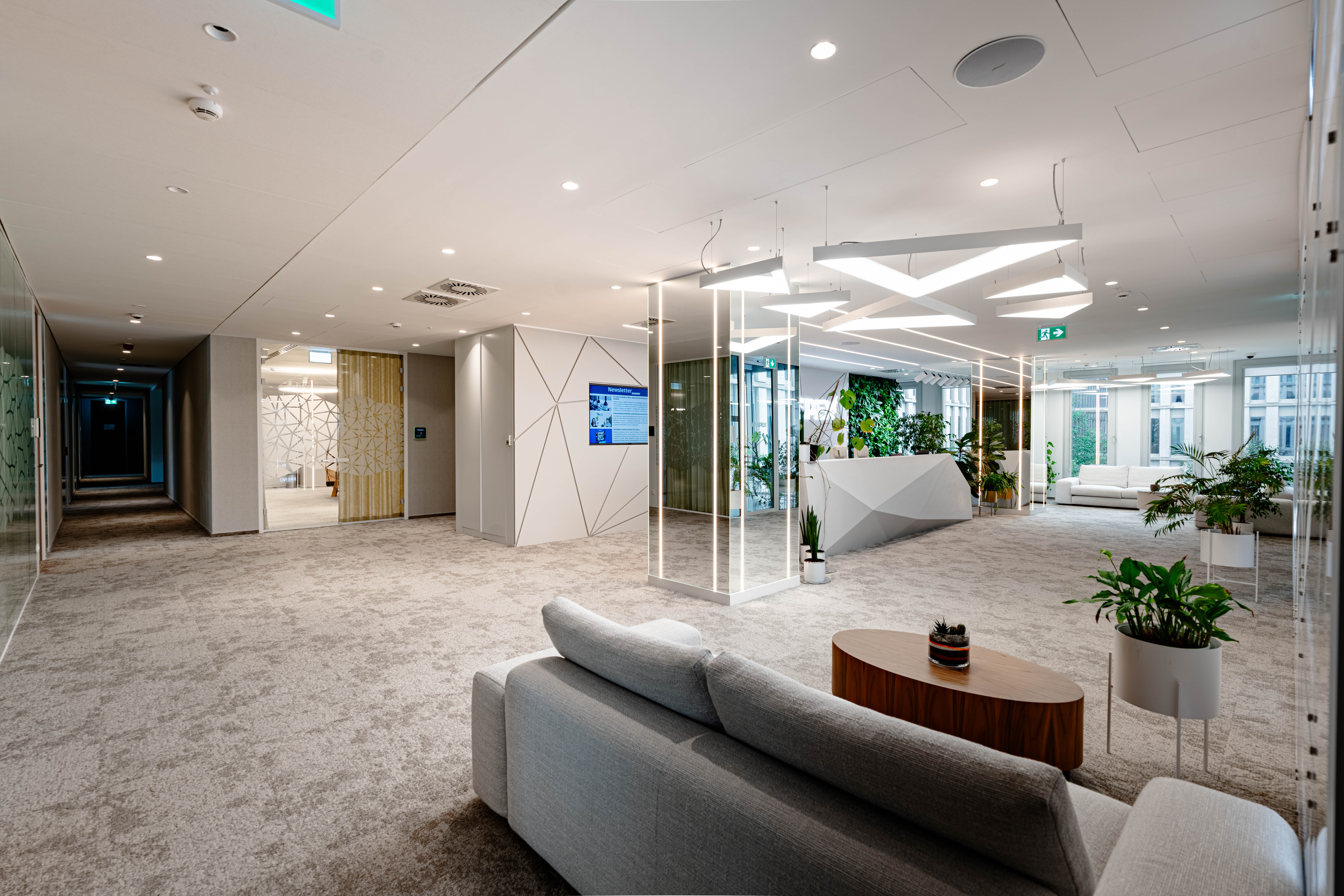 Recepcja biura została zaprojektowana jako spójne wprowadzenie do całości przestrzeni. Zastosowane materiały, oświetlenie i detale tworzą wyrazistą wizytówkę organizacji oraz prowadzą do stref przeznaczonych do współpracy. Modernizacja warszawskiego biura Grupy Maspex stanowiła kompleksową aktualizację środowiska pracy – od aranżacji po funkcjonalne rozwiązania. Każdy element, w tym wykończenia, akustyka i systemy oświetleniowe, został dobrany z myślą o poprawie komfortu i efektywności codziennej pracy.